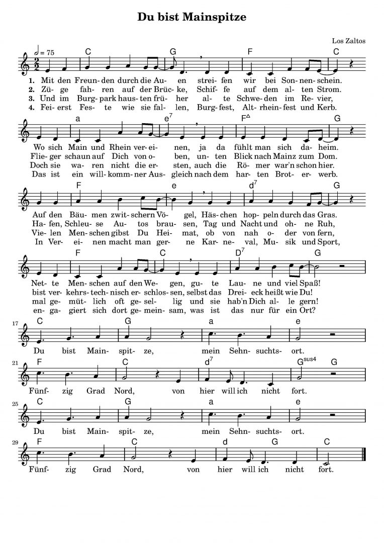 1.Preis (400,- Euro):  Julia und Alexander Zalto, 9. Und 10. Schuljahr für den Song „Du bist Mainspitze“. Eine große Recherche zur Mainspitze geht in die Lyrics der vier Strophen und Refrain ein – die Schweden, die Römer, der Blick zum Dom, die 50° nördlicher Breite, die Natur, als Kontrast die heftige verkehrstechnische Erschließung, wo selbst (unbeabsichtigt lustig) das Autobahn-Dreieck „Mainspitz-Dreieck“ heißt. Feste feiern – Altrheinfest, Kerb, Burgfest, mit vielen Kulturen, und alles in eine feine Melodie gesetzt.